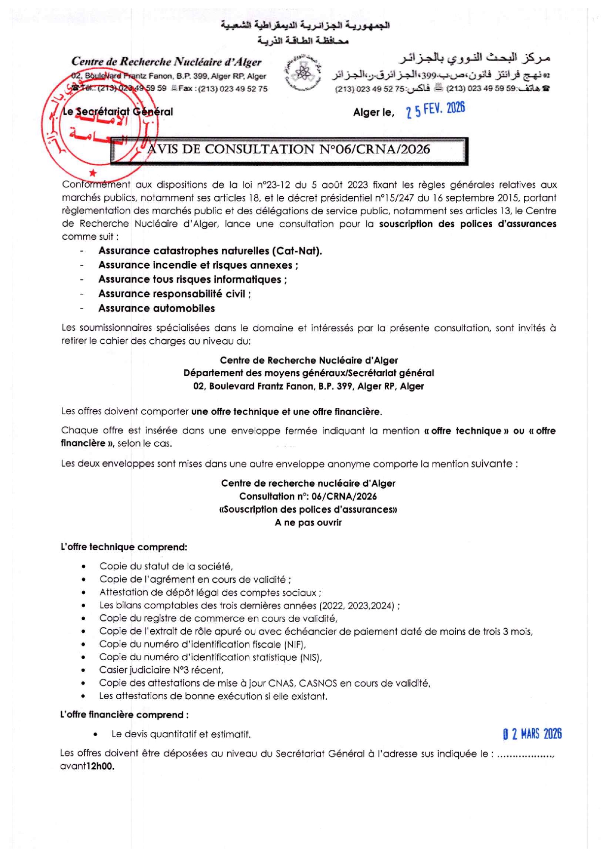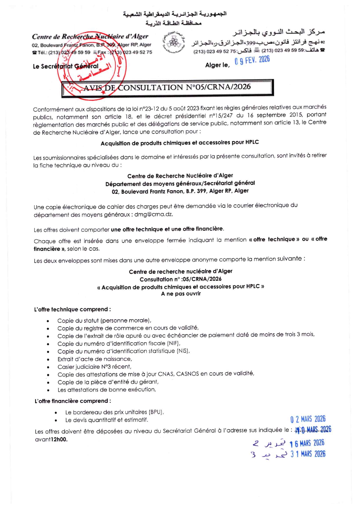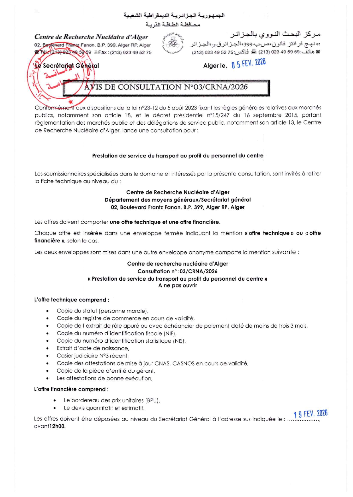 Nouveaux numéros téléphoniques du Centre de Recherche Nucléaire d’Alger (CRNA).