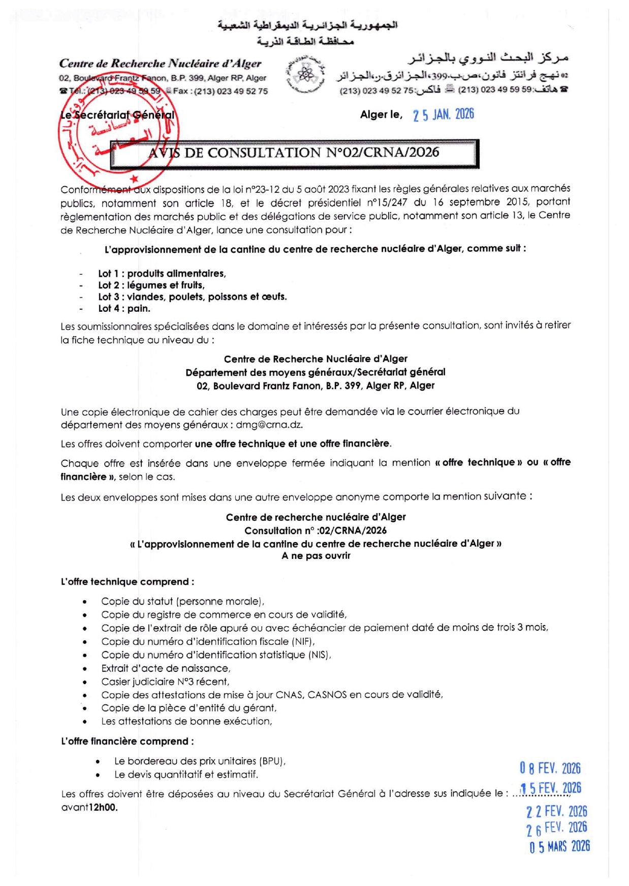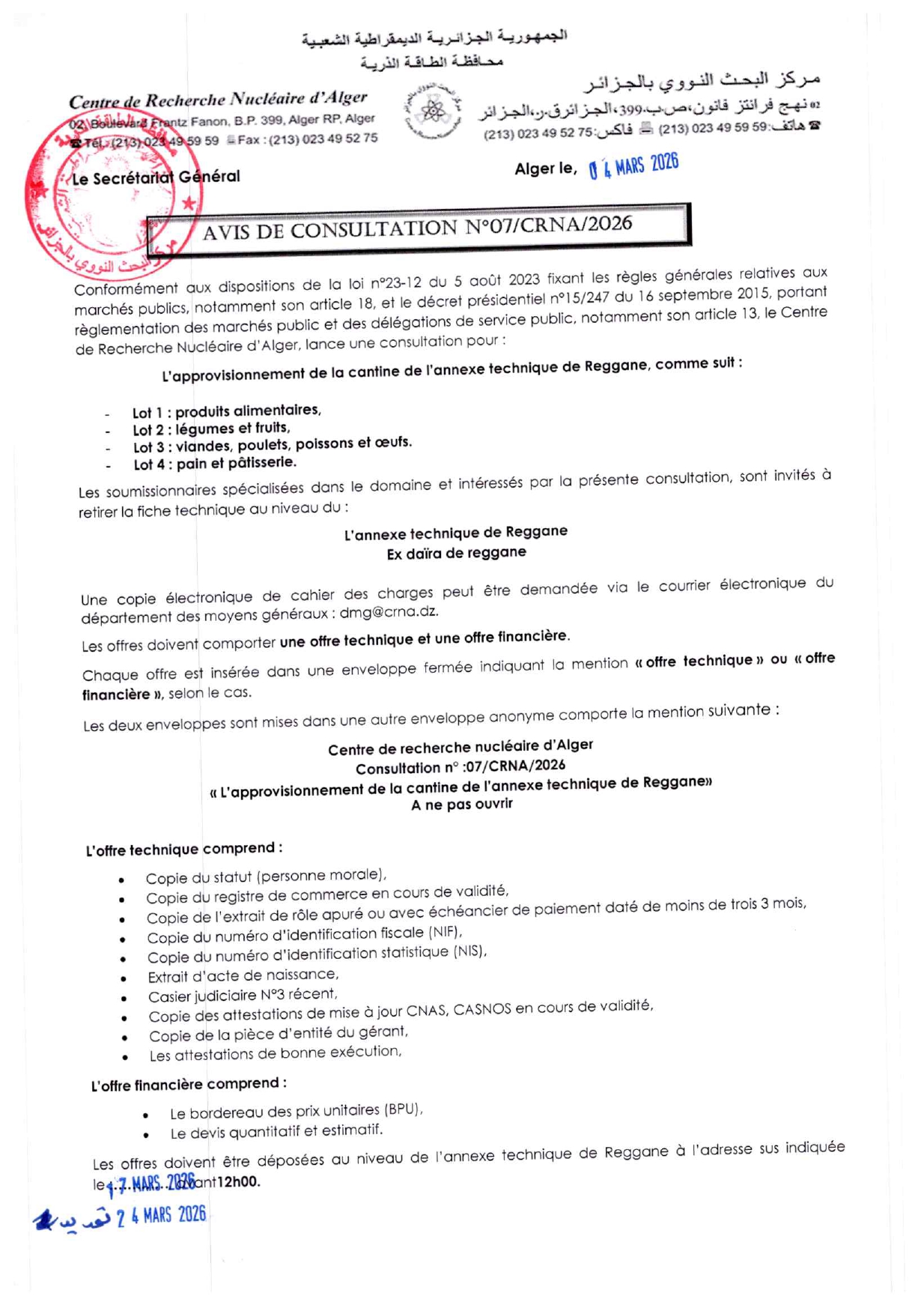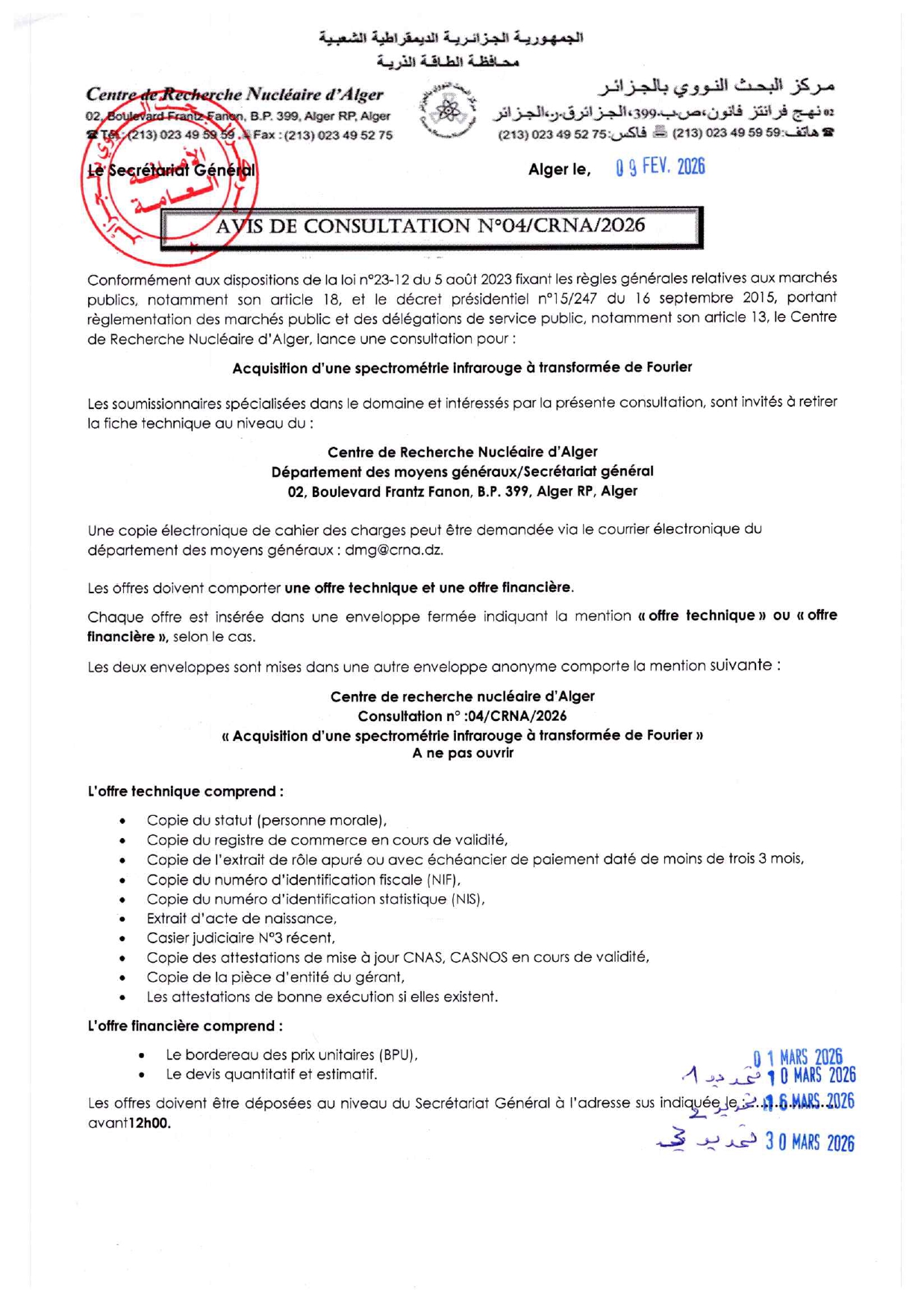 Nouveaux numéros téléphoniques du Centre de Recherche Nucléaire d’Alger (CRNA).